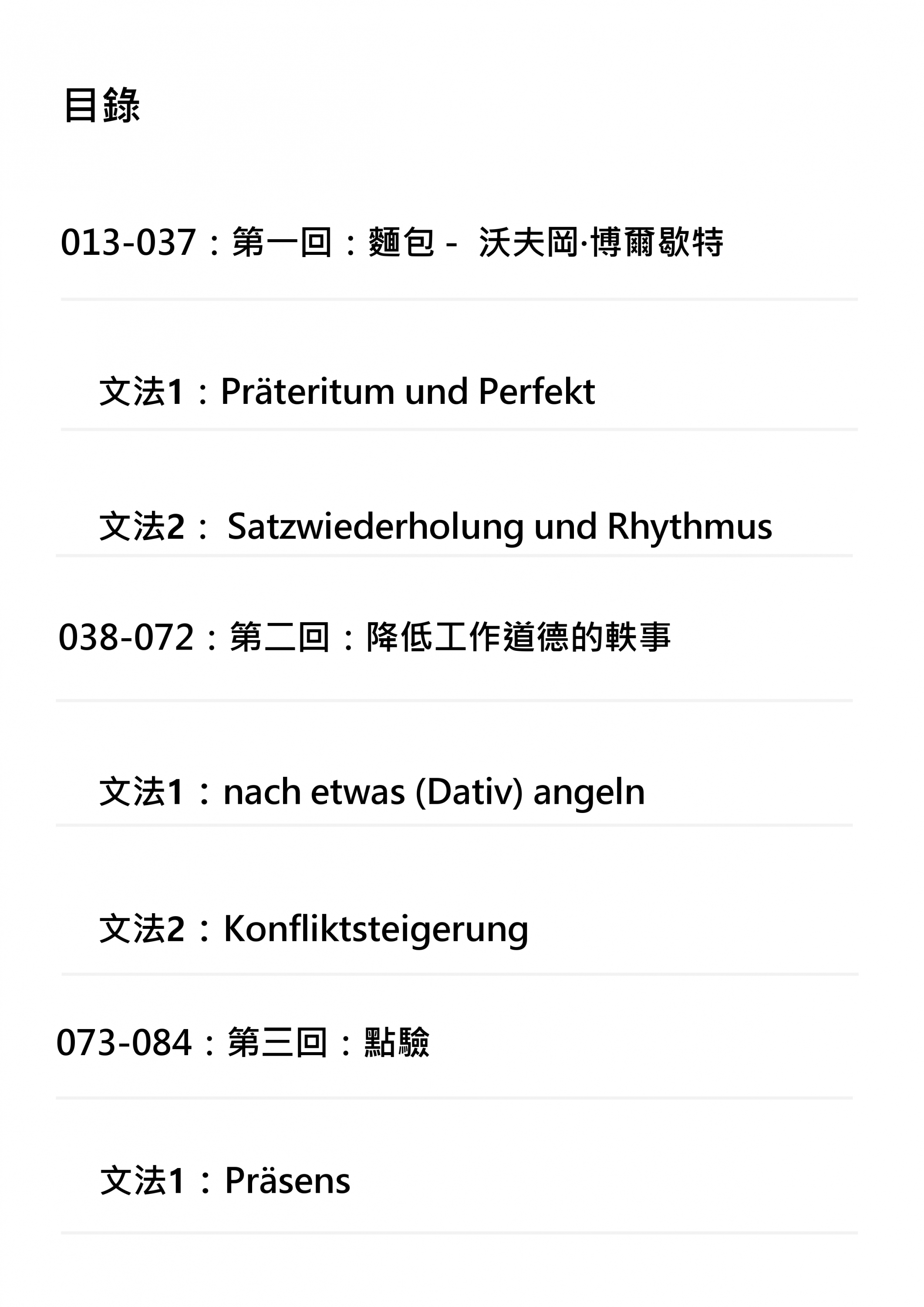 在山腳下,我們學習如何問路、如何點餐、如何購物(正如我們在 DE001 到 DE003 中所做的);到了山腰,我們學習如何表達情緒、如何撰寫吸引人的文案(這是 DE004 與 DE005 的任務)。許多學習者在到達這裡後,便覺得心滿意足,停下了腳步。因為他們覺得:「這些德語已經夠用了。」