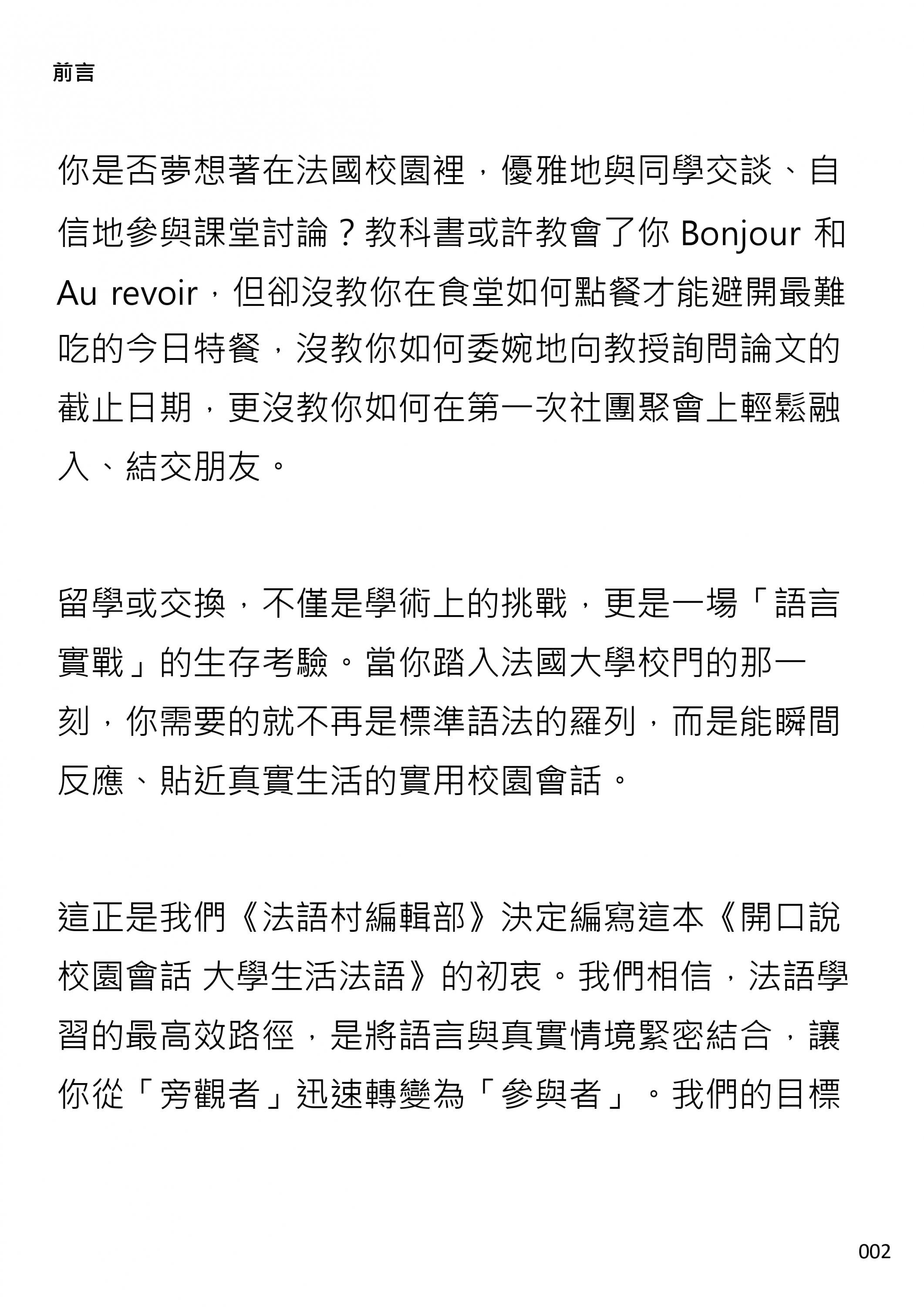 這正是我們《法語村編輯部》決定編寫這本《開口說校園會話 大學生活法語》的初衷。我們相信,法語學習的最高效路徑,是將語言與真實情境緊密結合,讓你從「旁觀者」迅速轉變為「參與者」。我們的目標非常明確:用最簡潔、最實用的方式,為你打造一條直通法國大學生活的語言快車道,讓你在複雜的校園環境中,也能流暢、自信地開口。