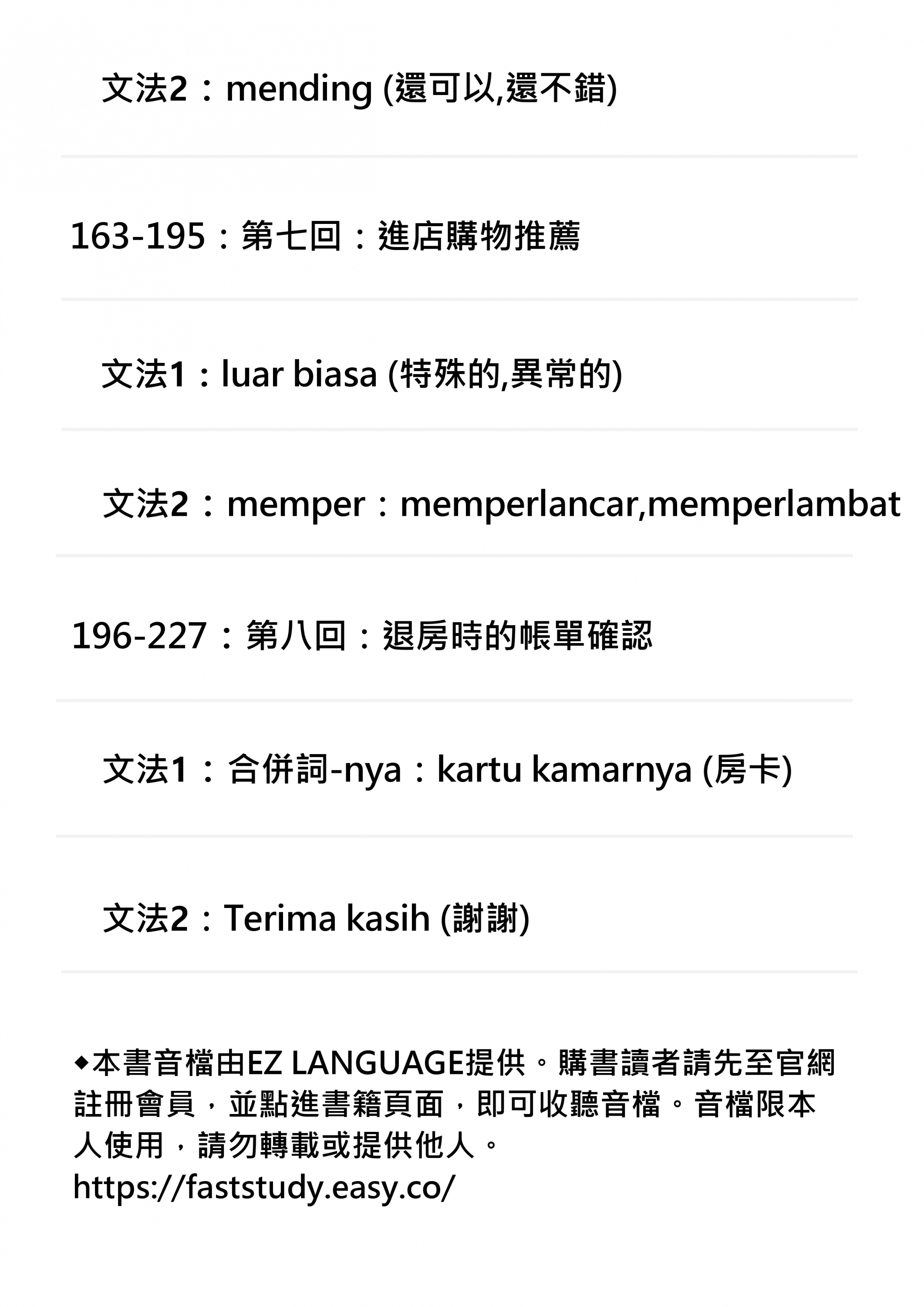 本書採用循序漸進的學習方法,內容涵蓋基礎到進階的印尼語詞彙及句型。我們建議讀者每日花費一定的時間閱讀、練習對話,並參考書中的場景模擬,實際應用所學。此外,書中附有配套的音檔,方便讀者隨時進行聽力練習。