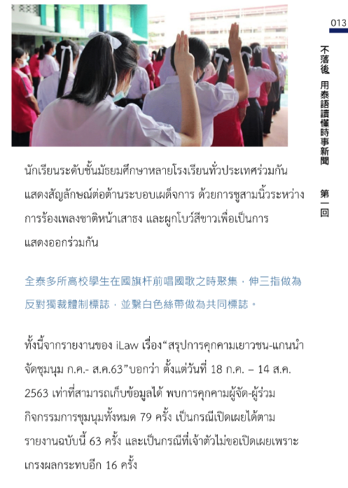 011 《第一回:全泰多所學校學生相約伸出三 指並繫白色絲帶反對獨裁》