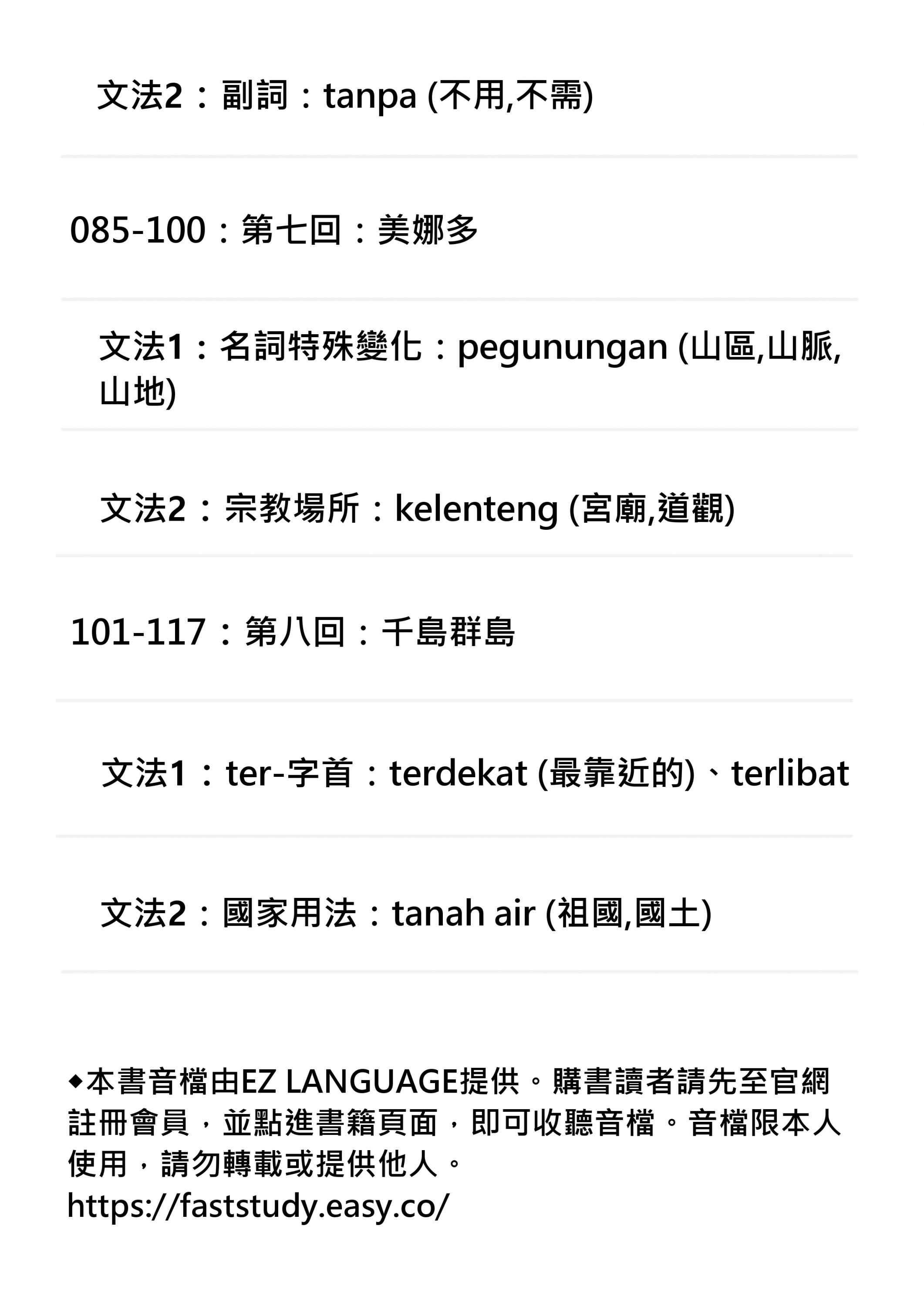本書設計了多樣化的學習方式,包括實用對話、常見詞彙、短語和文化小知識,並配合豐富的圖片與實地案例,讓您在輕鬆愉快的氛圍中學習印尼語。讀者可以逐章進行學習,也可以根據自己的需求選擇特定的主題,例如餐飲、交通或景點介紹。